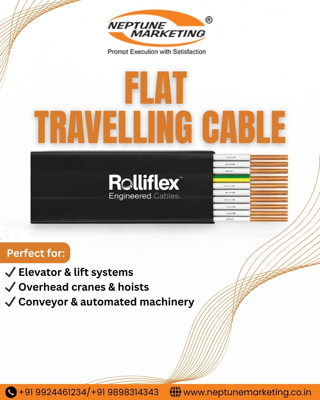 Neptune Marketing is a leading Flat Travelling Cable Manufacturer in India, offering high-quality cables designed for continuous motion applications, including elevators, cranes, hoists, and industrial automation systems. Our flat travelling cables are engineered for seamless power and control transmission, ensuring smooth operation even under constant bending, twisting, and flexing. Their flat design enables better heat dissipation, greater space efficiency, and improved torsional balance, preventing cable twisting during movement.