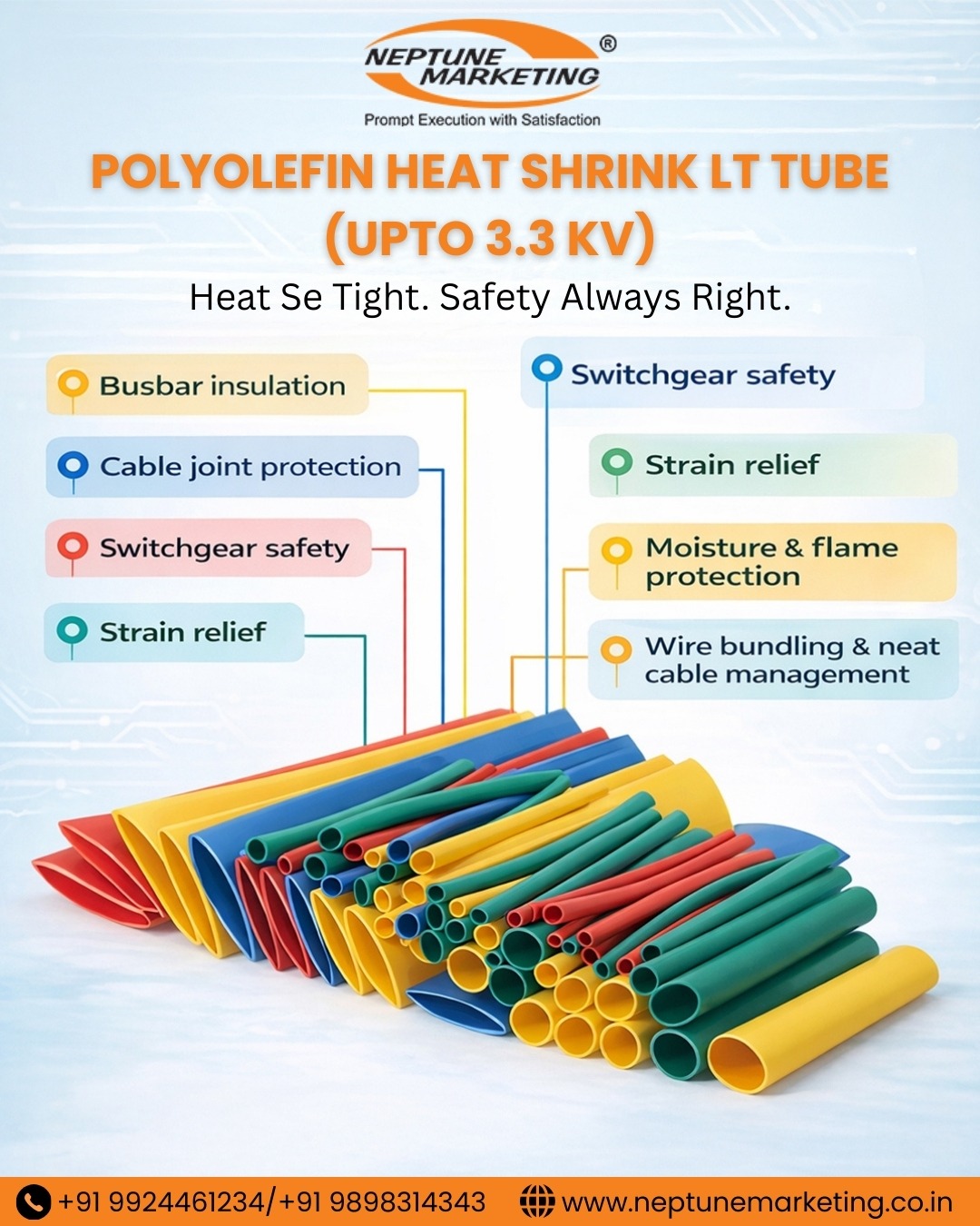 Neptune Marketing is a trusted supplier of polyolefin heat shrink LT tubes in India and Gujarat. We provide durable, high-quality electrical insulation solutions. Choose us for reliable, long-lasting, and safety-compliant heat shrink tubes.